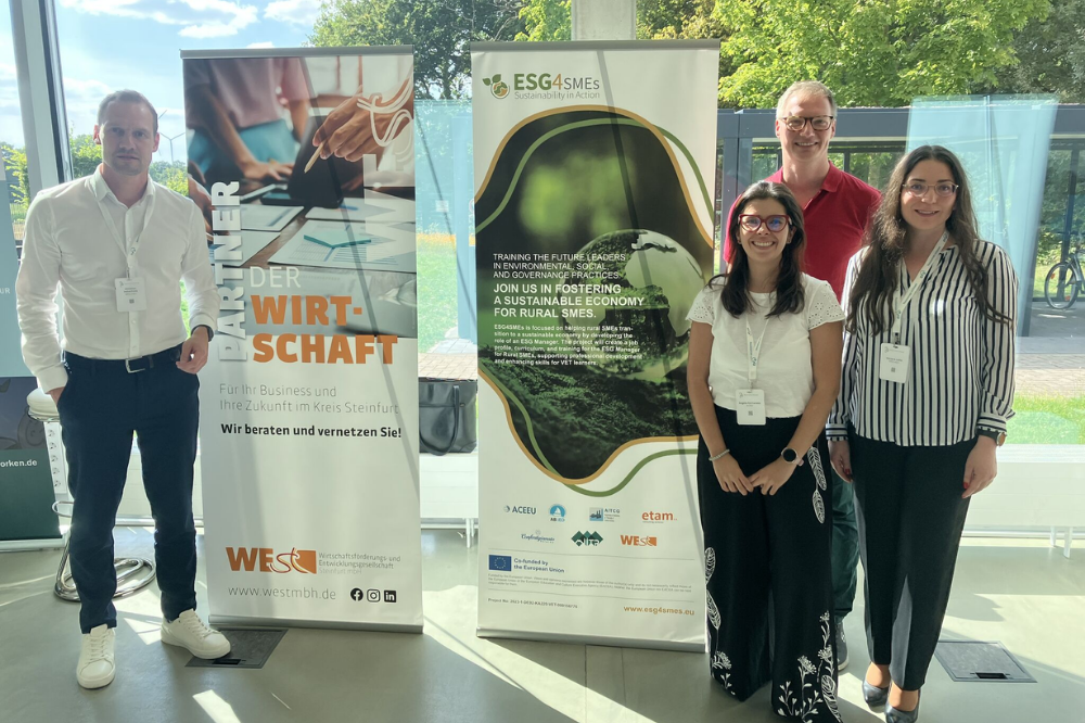 One of the highlights of the forum was the panel discussion moderated by Christian Holterhues of WESt, a partner from the ESG4SMEs project. The session brought together Sustainability officers, Sasha Kasandra Adam (apetito AG), Jan-Oliver Hense (Crespel & Deiters Group), Tessa Dingwerth (Theodor Schemberg Einrichtungen GmbH), and Michael Clostermann (SAERTEX multiCom Group), who shared first-hand how ESG strategies are developed and implemented within their companies and the challenges they face along the way.