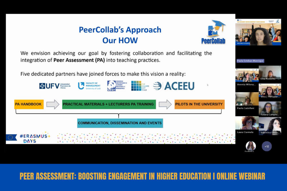 Celebrating #ErasmusDays, ACEEU, together with the PeerCollab Project and partners Francisco de Vitoria University (UFV), University Consortium for Industrial and Managerial Economics (CUEIM), The Square Dot Team (TSDT), and University of Lodz (UoL), hosted a webinar to explore the potential of peer assessment in boosting engagement and student success in higher education. Moderated by ACEEU and connecting 25 participants from five countries in Europe, the session gave PeerCollab the opportunity to share its mission, vision, and approach with the wider community. Guided by the slogan “Shaping future-ready classrooms and creating lasting, positive change in education,” the project focuses on fostering collaboration and integrating Peer Assessment (PA) into teaching practices.